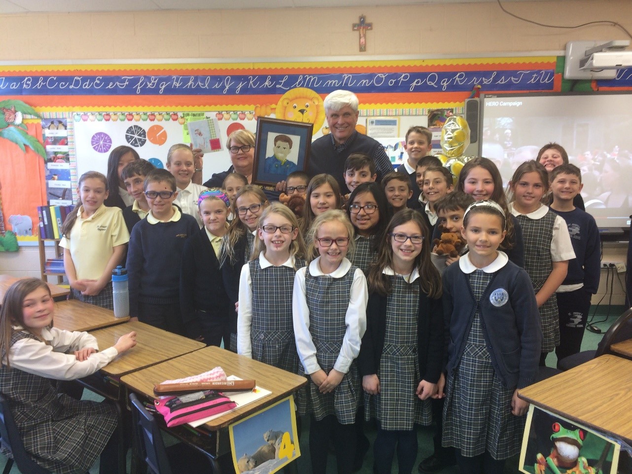 SOMERS POINT, NJ (March 14, 2017) – Bill and Muriel Elliott, founders of the John R. Elliott HERO Campaign for Designated Drivers, were honored guests of Sylvia McFadden’s third-grade class and students from the SJRS Book Project at St. Joseph Regional School in Somers Point. The class presented a student portrait of their son, Ensign John R. Elliott, and a copy of the students’ newly published book, Jersey Shore HEROES. The book, which is on sale at the Shore Medical Center Gift Shop as a fundraiser for the Shore Cancer Center in Somers Point, includes John’s story and the creation of the HERO Campaign in his memory. Books can also be ordered directly at Read4McFadden@gmail.com.
