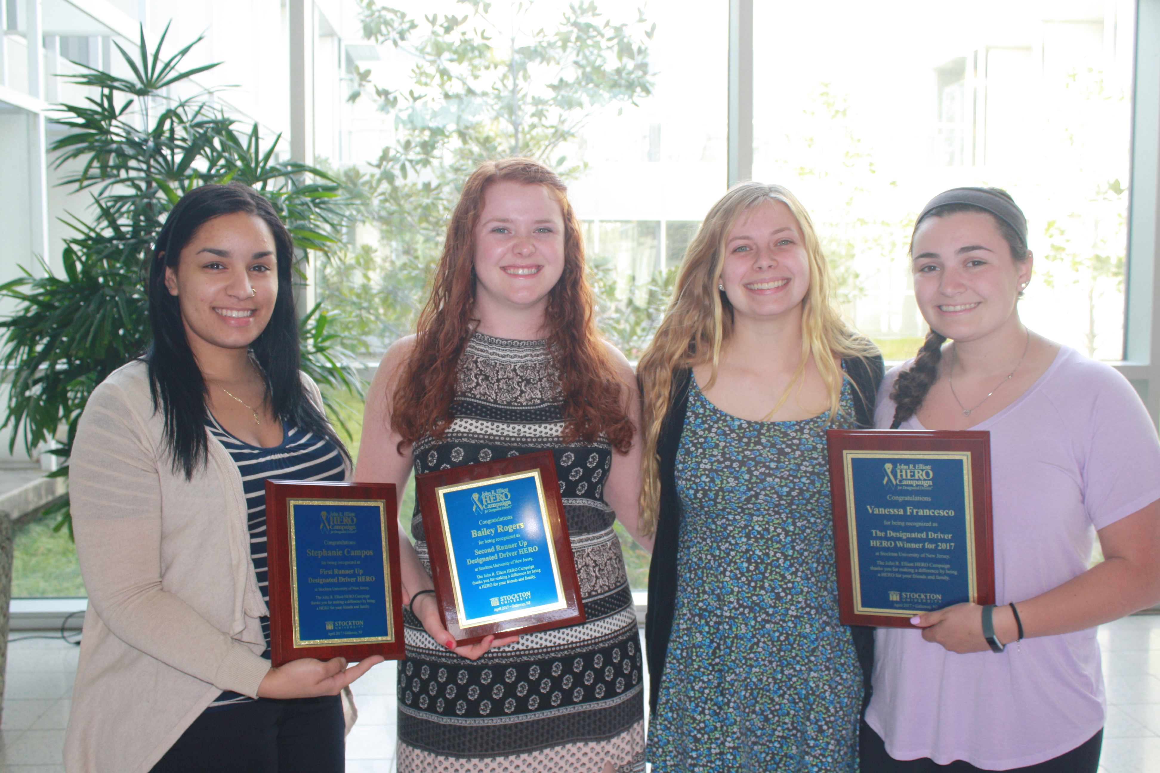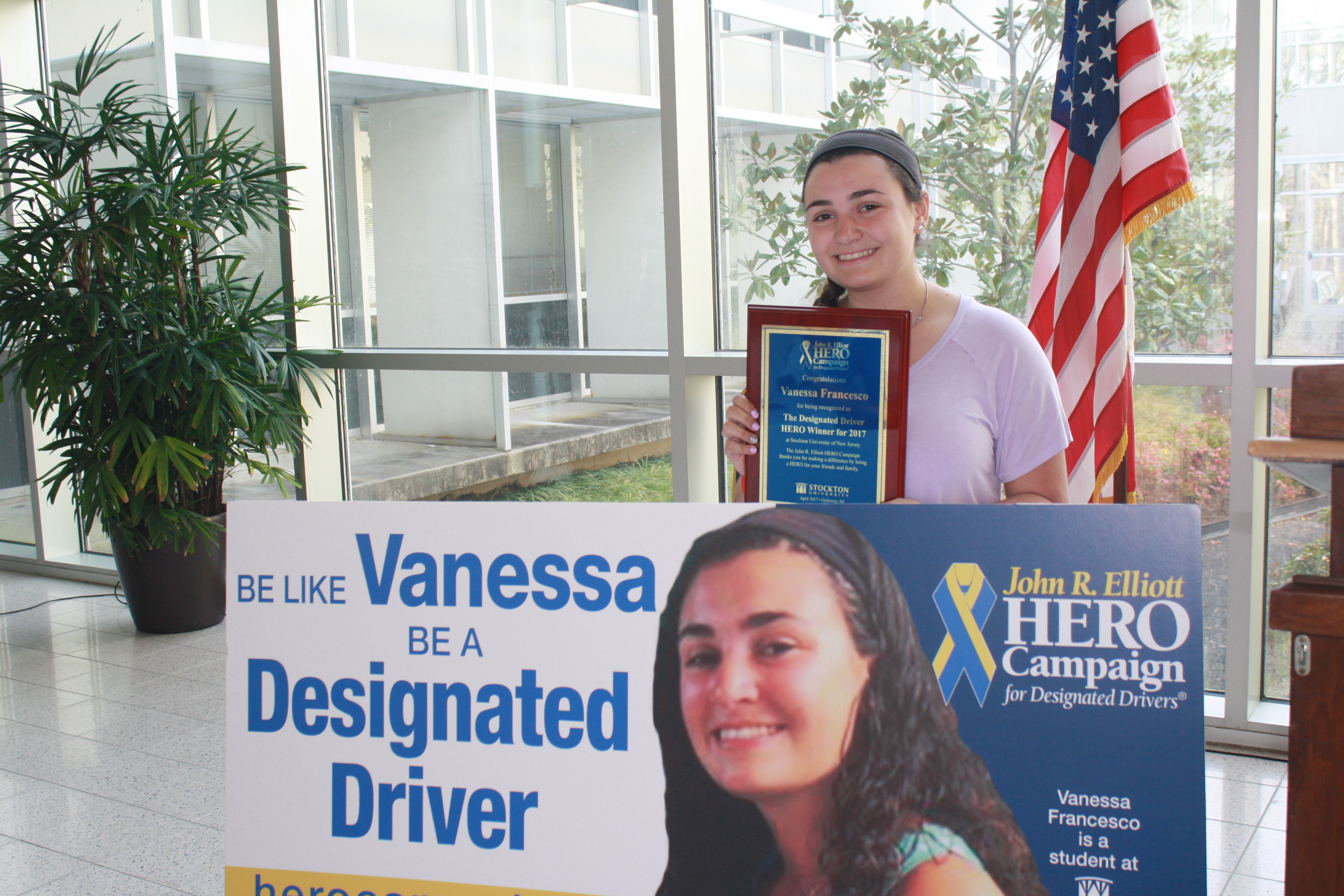 GALLOWAY TOWNSHIP, NJ (April 13, 2017) – Vanessa Francesco, a 20-year-old health science major from Somers Point, was named the 2017 HERO of the Year at Stockton University on Tuesday, April 11. The HERO of the Year is a student who exemplifies ‘HERO’ qualities in serving as a safe and sober designated driver for friends and family.