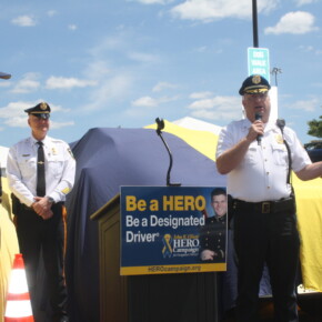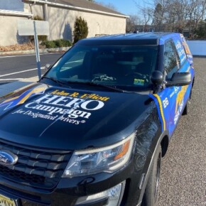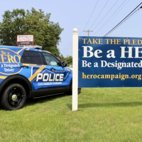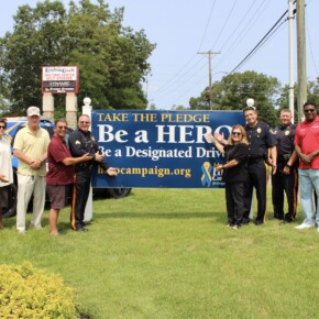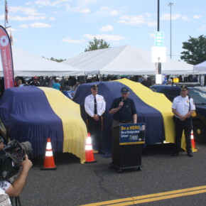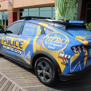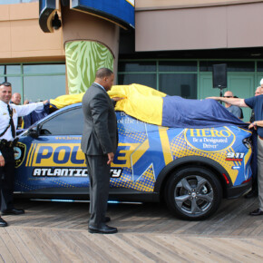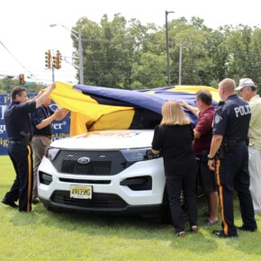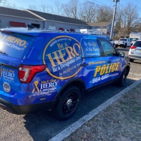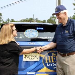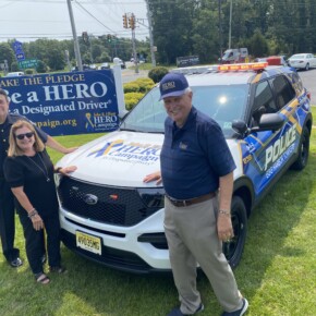 Prior to the start of the 2023 HERO Walk on Sunday, October 15, 2023, the HERO Campaign unveiled a new Stockton University HERO-wrapped patrol vehicle in memory of Kevin Ade, a Stockton student who was killed by a drunk driver in 2007. Ade’s family members are pictured removing the cover from the vehicle, revealing the HERO Campaign logo and decal tribute to Ade.